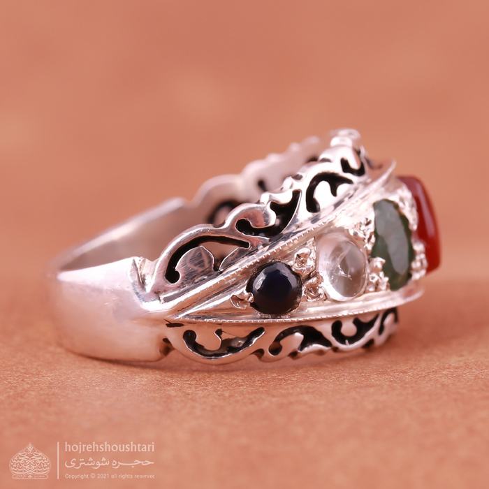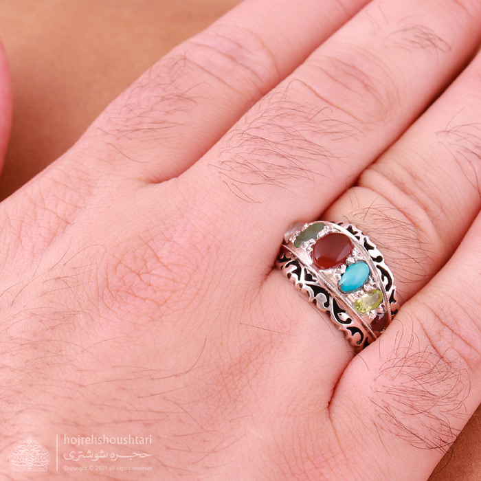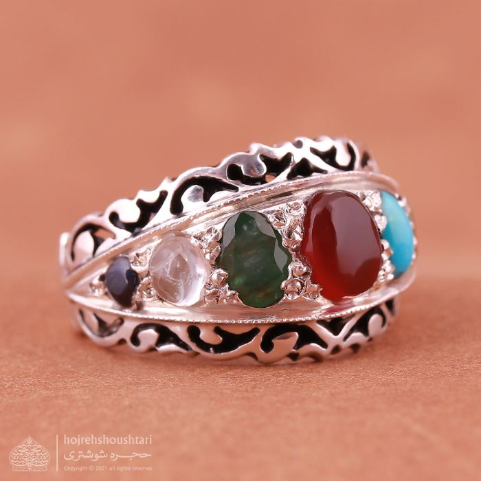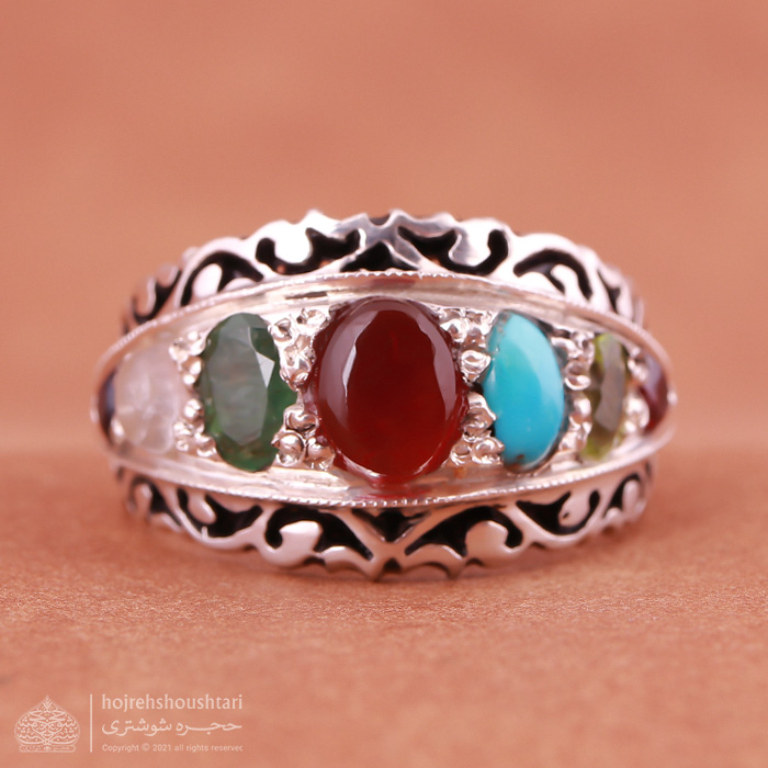 انگشتر نقره 7 جواهر حرز دار مردانه/زنانه شامل سنگ های: عقیق یمنی- فیروزه نیشابور - یاقوت - زبرجد - درنجف - زمرد و...